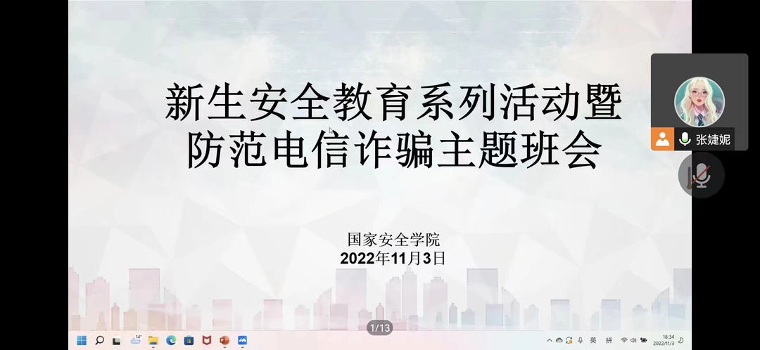 为普及防范电信诈骗相关常识,提高同学们防范网络诈骗意识,保障同学们的人身、财产安全。9428cn太阳集团于2022年11月3日晚通过线上方式召开“防范电信诈骗”主题班会。本次会议由张婕妮老师主持,李俊辰同学主讲,2022级全体学生参会。