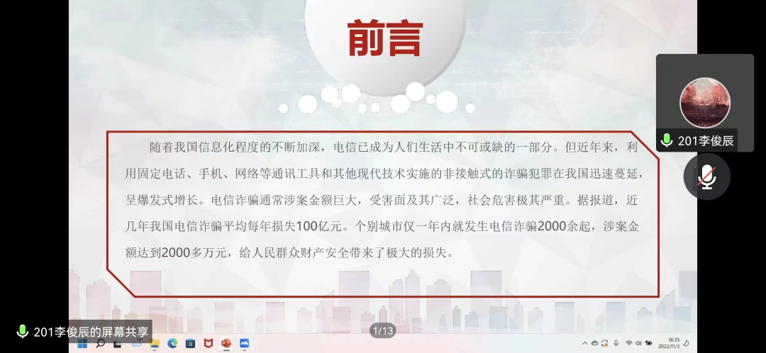 李俊辰同学分享了电信诈骗的现实状况。近年来,利用固定电话、手机、网络通讯工具和其他现代技术实施的非接触式诈骗犯罪在我国迅速蔓延,呈爆发式增长。涉案金额巨大,受害面极广泛,社会危害极大。
