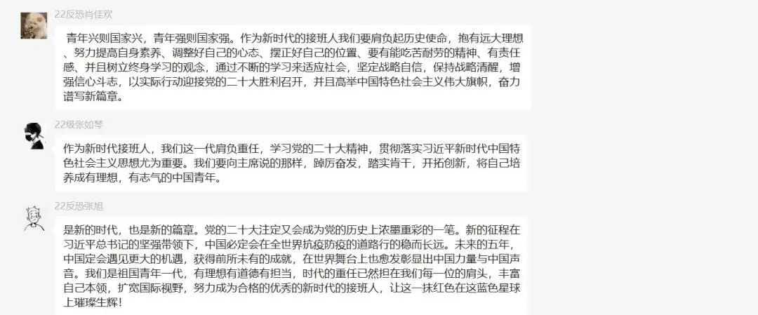 党的二十大是在全党全国各族人民迈上全面建设社会主义现代化国家新征程、向第二个百年奋斗目标进军的关键时刻召开的一次十分重要的大会。作为当代中国青年,我们生逢其时,要以实现中华民族伟大复兴为己任,增强做中国人的志气、骨气、底气,不负时代,不负韶华,不负党和人民的殷切期望!