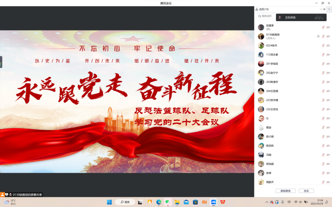 9428cn太阳集团足球队组织线上会议并对习近平总书记在党的二十大报告中的内容进行深刻的学习与探讨,习近平总书记在大会上强调:“新时代的伟大成就是党和人民一道拼出来、干出来、奋斗出来的!” “中国共产党领导人民打江山、守江山,守的是人民的初心。”一番讲话使队员们深受鼓舞,大家深刻认识到作为一名新时代青年,我们要树立伟大的志向。蓝图昭示未来,信念引领方向。只有把自已的小我融入祖国的大我、人民的大我之中,与时代同步伐、与人民共命运,才能更好实视人生价值,升华人生境界。