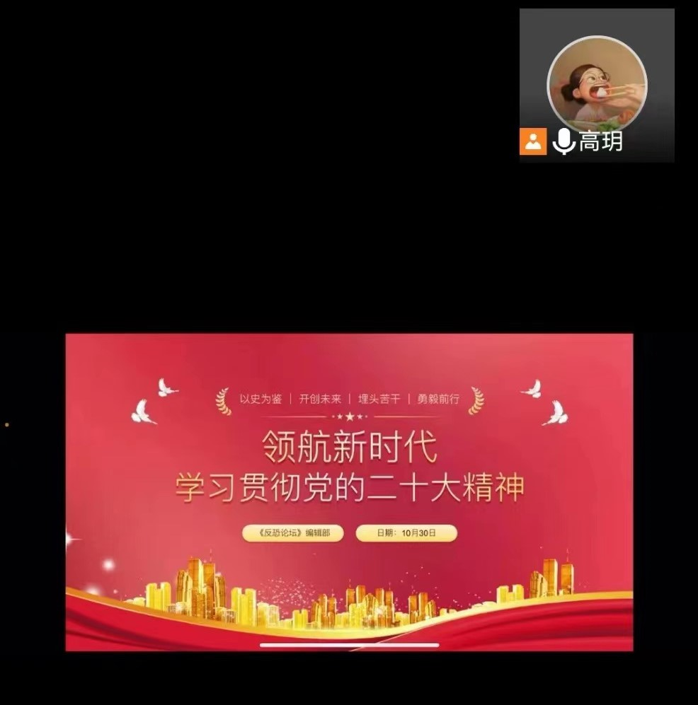 10月30日,《反恐论坛》编辑部在线上学习了党的二十大精神。编辑部成员通过此次学习,更加深化了中国共产党领导决定中国特色社会主义的性质;中国共产党是中国特色社会主义制度最大优势、最本质特征;中国特色社会主义的优势体现在理论、道路、制度、文化等多方面的认识。