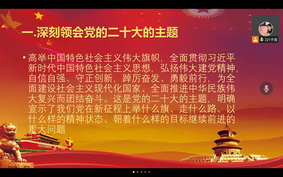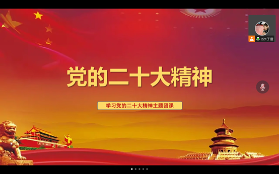 会上,团支部书记于滢围绕“党的二十大精神”这一主题带领同学们认真学习思考,就学习体会进行交流讨论,同学们纷纷表示将积极学习党的二十大精神,以党的代代征程为榜样,立足岗位,勇毅前行,以高度的责任感和使命感为实现第二个百年奋斗目标不懈奋斗,贡献青年智慧和力量。