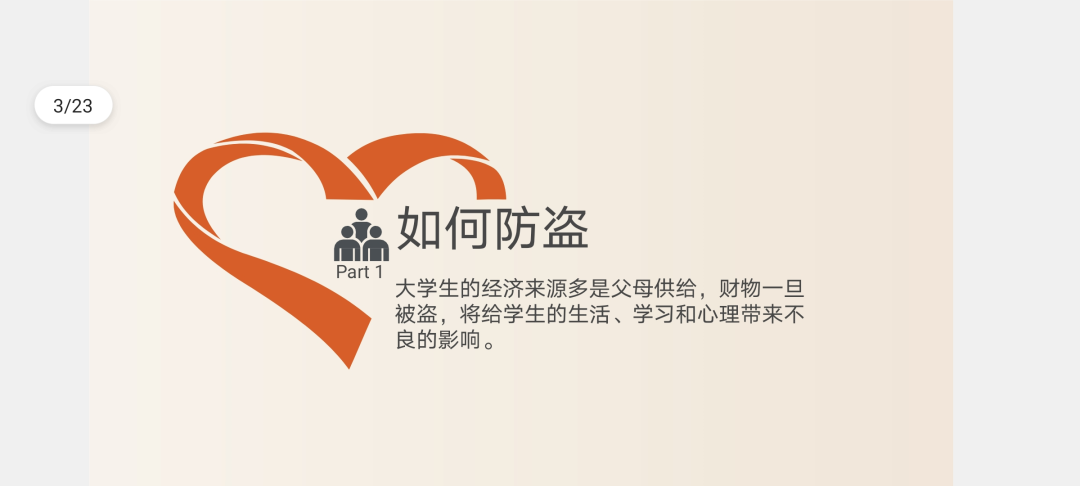 如何防盗方面,会议主要从宿舍防盗以及公共场所放盗两个方面让同学们提防盗窃,防止盗窃事件的出现。在宿舍同学们应养成随手关门,不留外人,提高警惕,思想重视,防范未然,保管好身份证件的习惯;在公共场所同学们应保持高度警惕,保管好自己的财物,防止被偷盗。