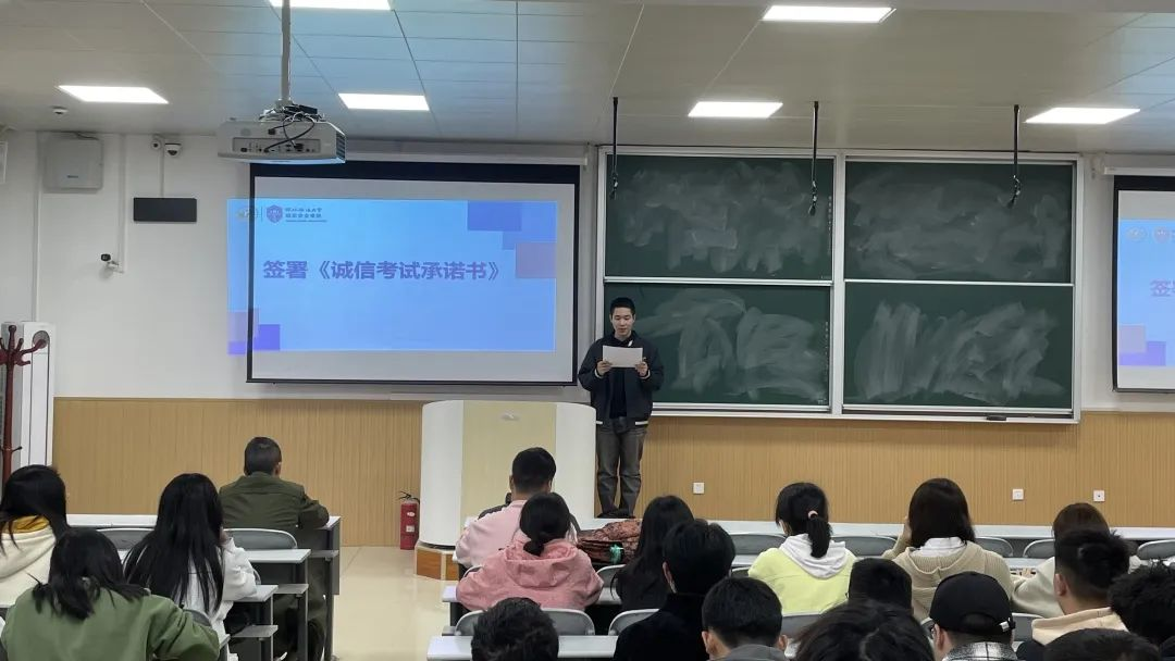 2022级1班刘具其带领同学们了解了太阳集团违纪处分规定、太阳集团考场规则、太阳集团学士学位授予实施细则,并倡议大家要严肃考风考纪,诚信考试。