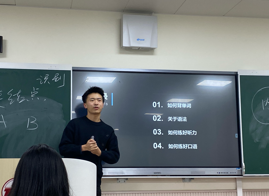 雷皓翔同学聚焦英语学习四个模块,剖析同学们在英语学习中遇到的问题根源,结合自身经验,进行方法分享。他建议大家针对自身需求和目的去寻找适合自己的学习方式,并总结了英语词汇记忆中的一些问题和解决方法。随后,他从语法学习的重要性出发,提出语言学习是一个长期的过程,坚持输入,长期内化才能提高输出能力。最后,他分享了听力和口语学习的有效方法,建议同学们要多听、多说、多读、多写、多思考,合理利用时间学习。