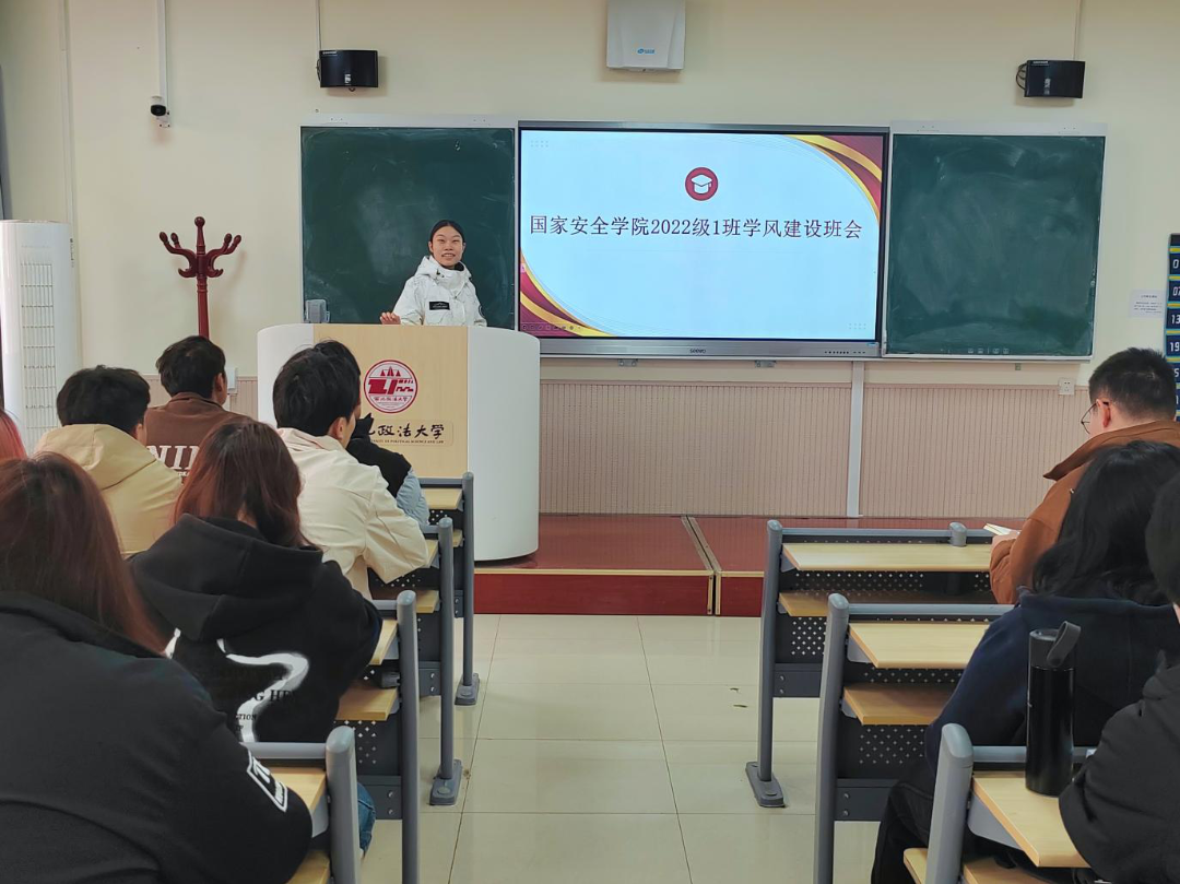 为增强学生纪律意识,营造良好课堂环境,9428cn太阳集团(反恐怖主义法学院)2022级1班于3月31日召开学风建设主题班会,本次班会由学习委员周紫嫣同学主持,2022级1班全体同学参与。