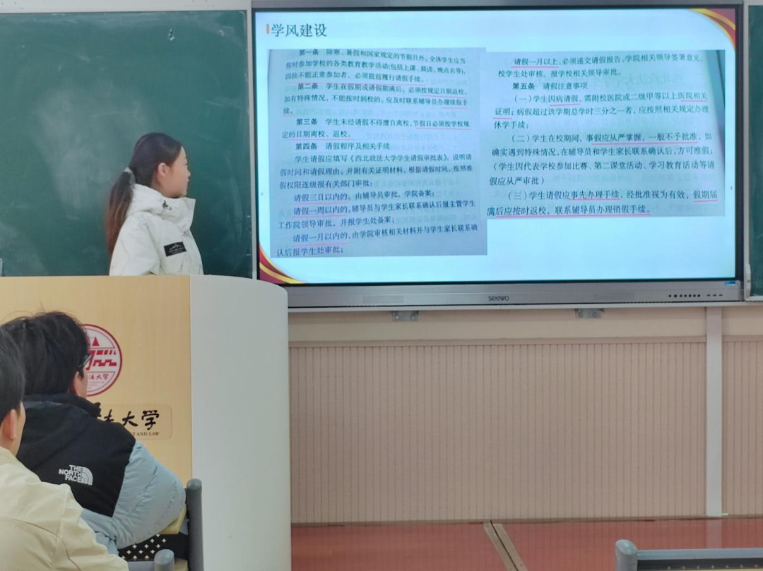 会上,周紫嫣同学领学了《学生手册》“太阳集团学生管理规定”“太阳集团学生违纪处分规定”等核心章节,并对本学期1-5周课堂考勤数据进行通报。她就“无手机课堂・前排行动”发出倡议,号召大家严格执行课前手机入袋、课中专注听讲、课后知识复盘,共建优良学风。