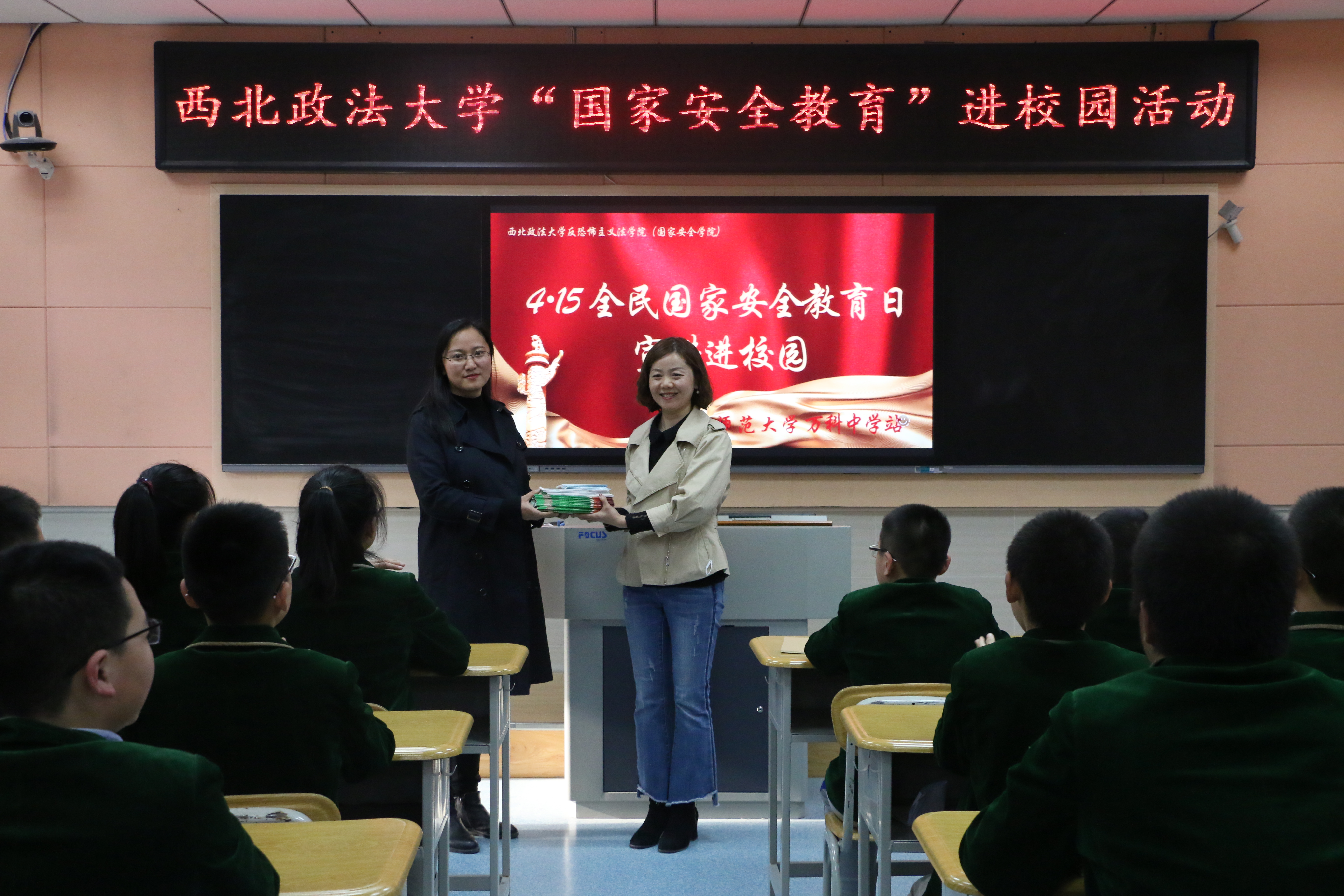 反恐怖主义法学院党委副书记侯颖怡代表学院向陕西师范大学万科中学赠送国家安全知识读本。