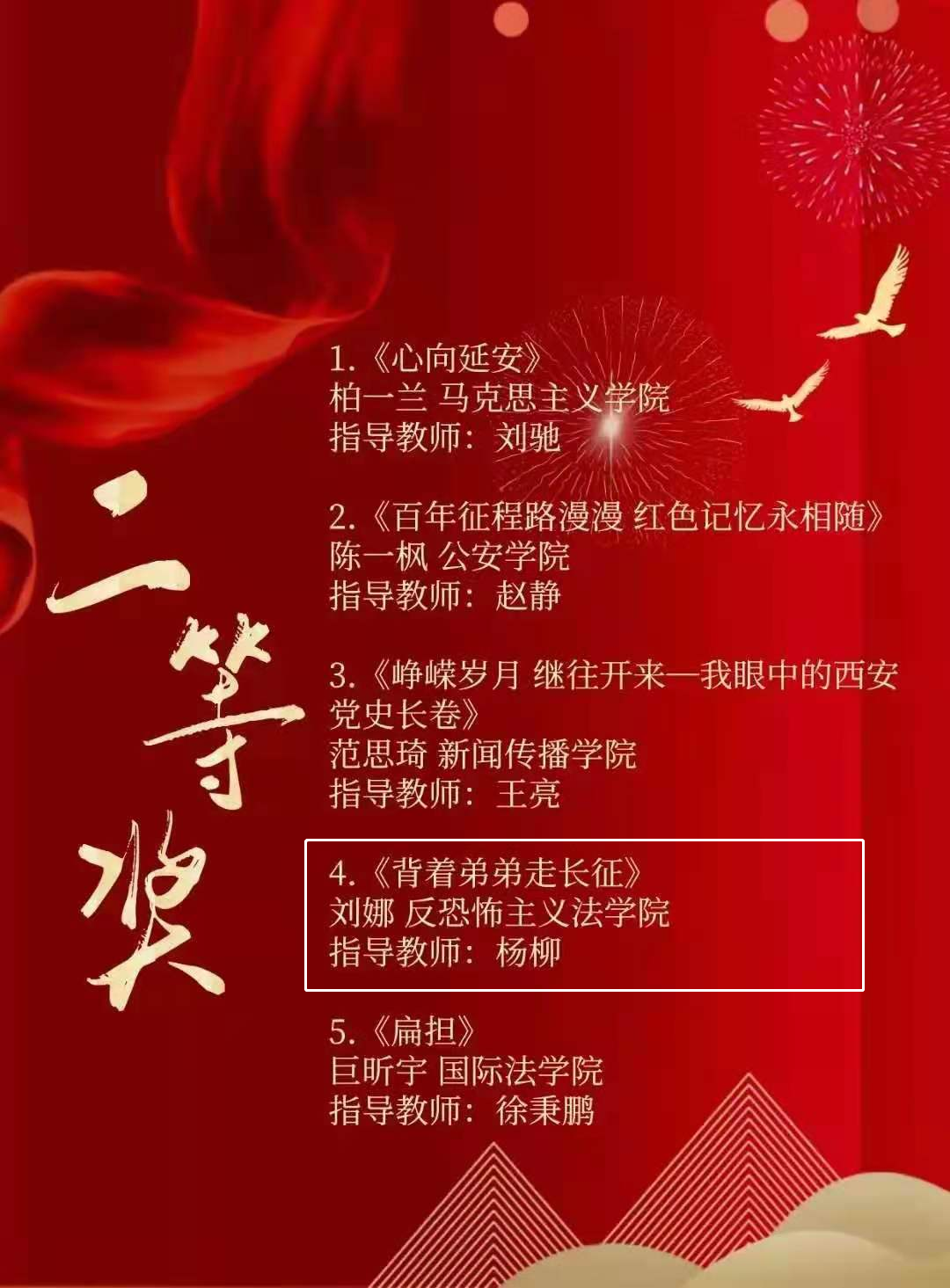 为了激励青年学生树立崇高理想,弘扬革命精神,传承红色基因,充分发挥党史以史鉴今、资政育人的作用,我校校团委举办了“百年献礼庆华诞 学好四史书青春”大学生书写党史故事大赛活动,我院2019级刘娜同学的作品《背着弟弟走长征》荣获二等奖。