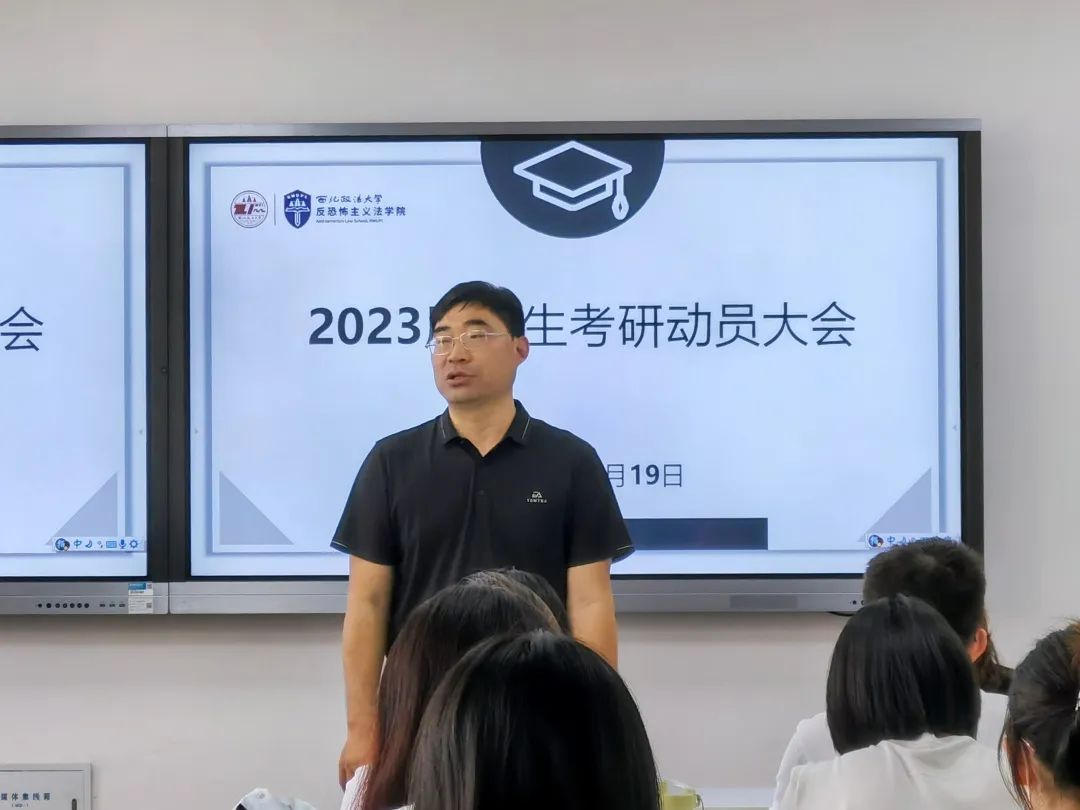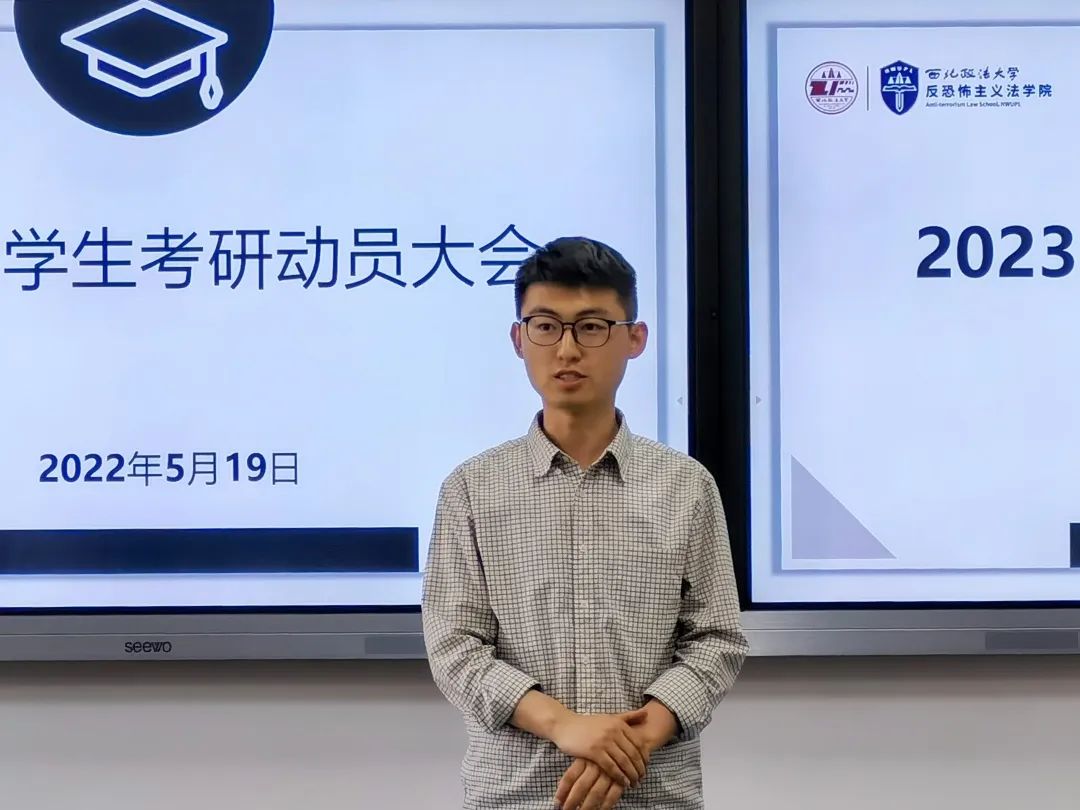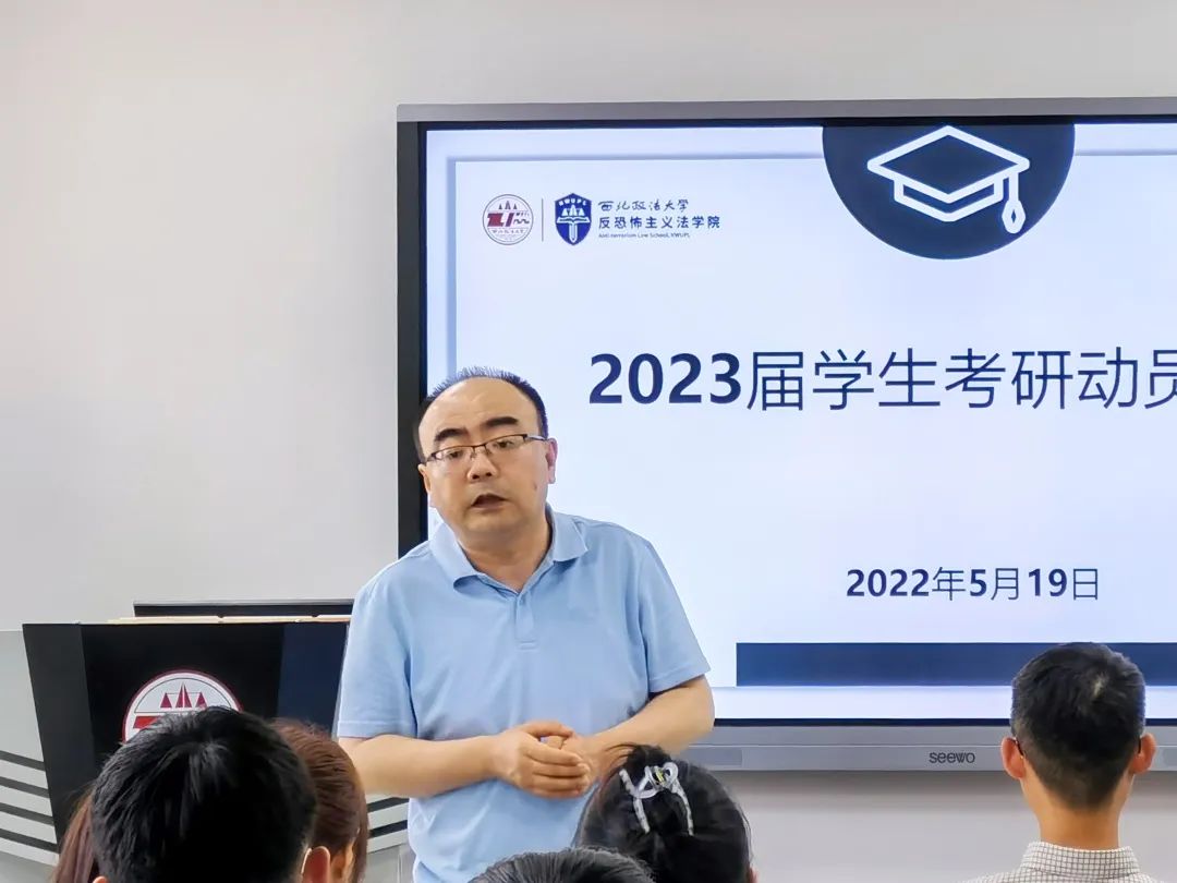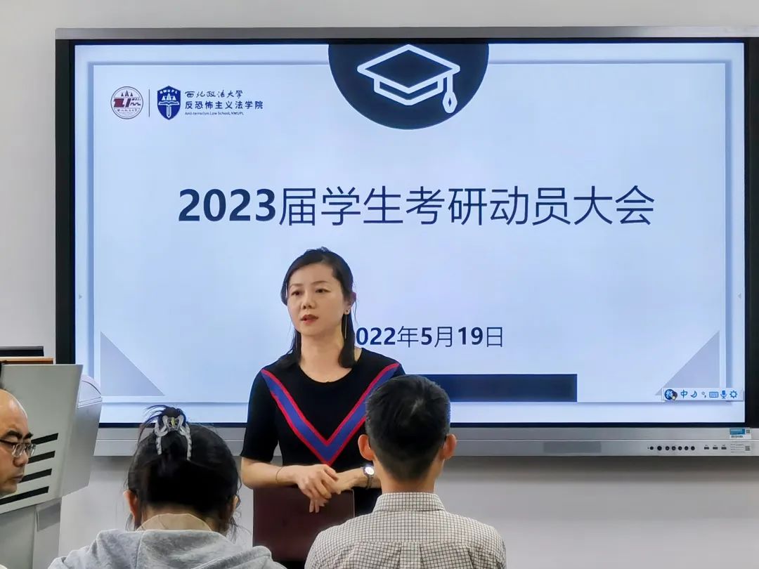 为帮助同学们明确考研方向,认清考研形势,树立考研信心,引导学生合理规划学习生活,积极备战考研,5月19日下午,反恐法学院于诚意楼306教室召开2023届学生考研动员大会。副院长宋海彬老师、副院长王东明老师、党委副书记侯颖怡老师作考研动员讲话,2019级、2020级全体同学通过线上线下参加。活动由团委书记杨柳老师主持。