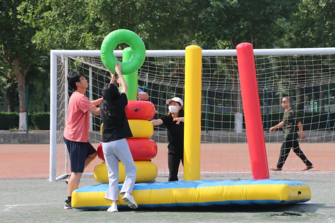 快乐铅笔游戏要求6名队员采用肩扛器械,奔跑至接力点,另外6名队友返回;“超级障碍赛”要求队员依次通过充气跨栏、平衡木、钻网通道、鱼跃龙门环节并接力,每一名运动员都全力以赴,奔跑的身影、挥洒的汗水,诉说着蓬勃的青春色彩。