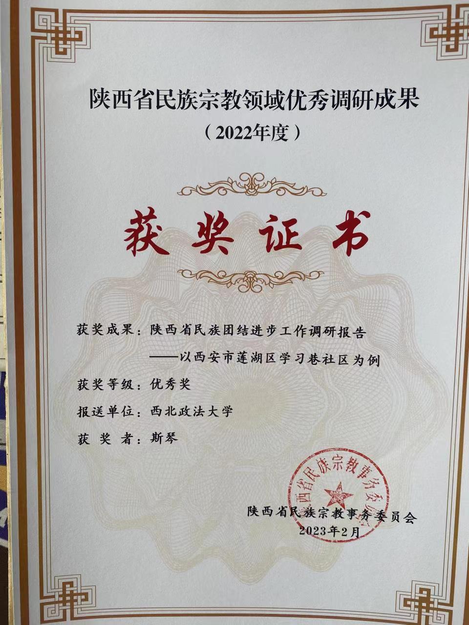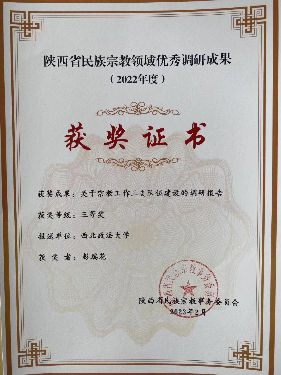 2023年2月,9428cn太阳集团教师两项调研成果荣获陕西省民族宗教领域优秀调研成果奖。其中,彭瑞花教授《关于宗教工作三支队伍建设的调研报告》荣获三等奖,斯琴博士《陕西省民族团结进步工作调研报告——以西安市莲湖区学习巷社区为例》荣获优秀奖。