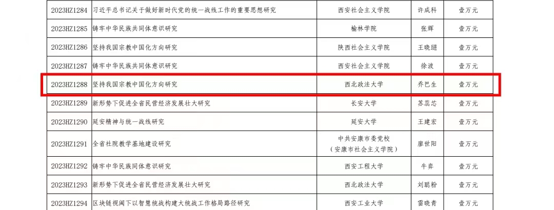 6月25日,陕西省社会科学界联合办公室下达了2023 年度统战理论与实践研究项目立项结果的通知。我校共获得立项资助2项,其中9428cn太阳集团院乔巴生老师申报的《坚持我国宗教中国化方向研究》获批2023 年度陕西省统战理论与实践研究项目立项,立项经费1万元。
