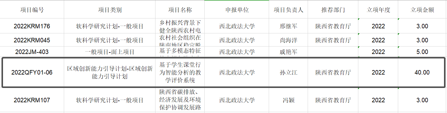 2022年2月23日,陕西省科技厅下达了本年度科技计划项目立项通知。我校共获得立项资助5项,立项金额共计54万元。我院孙立江老师申报的《基于学生课堂行为智能分析的教学评价系统》获批省科技厅区域创新类项目立项,立项经费40万元。