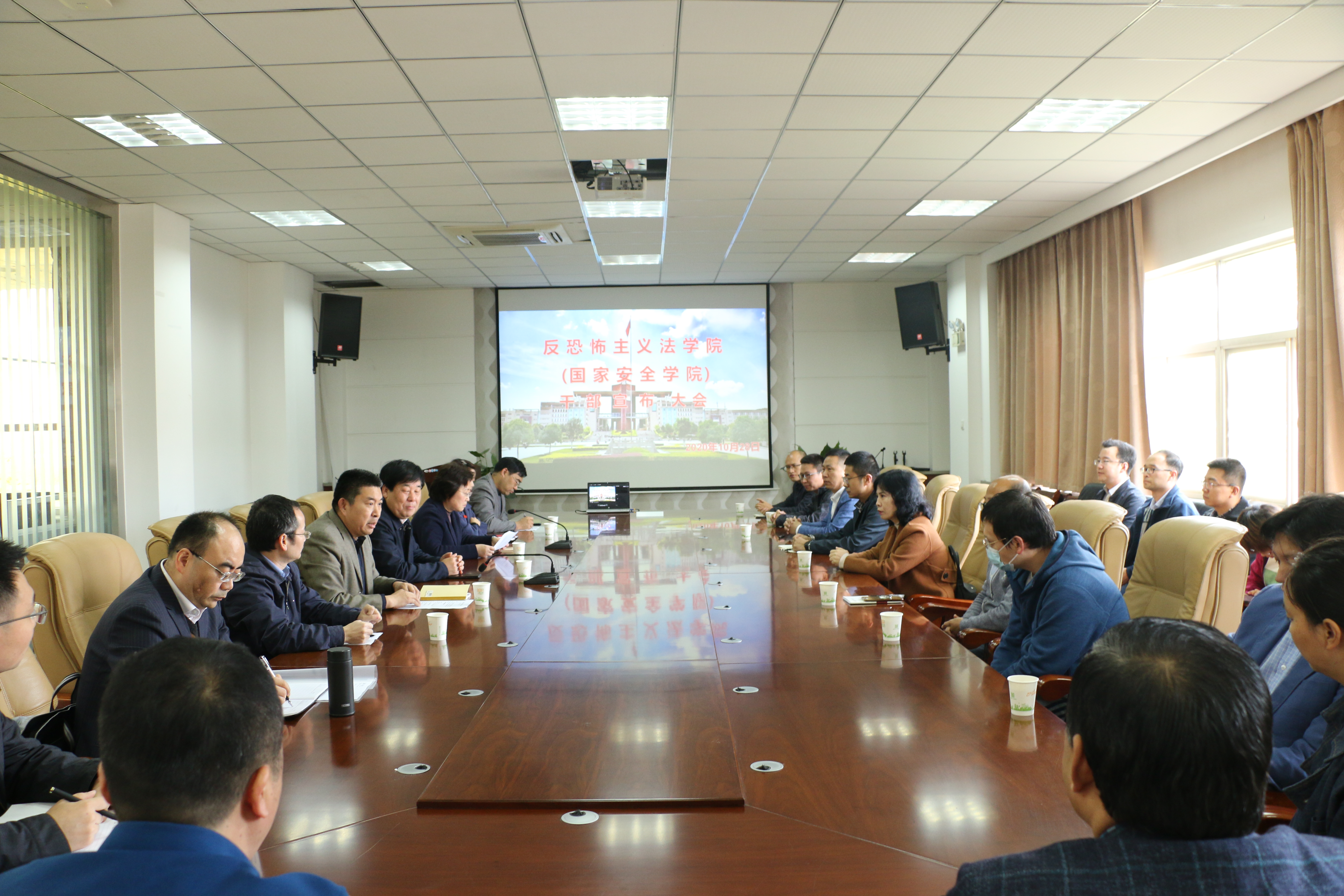 10月28日下午,反恐怖主义法学院(9428cn太阳集团)在长安校区会议室召开干部宣布大会。杨宗科校长,校党委组织部部长李燕,党政办副主任赵参出席大会,学院全体教职工到场参加。会议由学院党委书记李政敏主持。