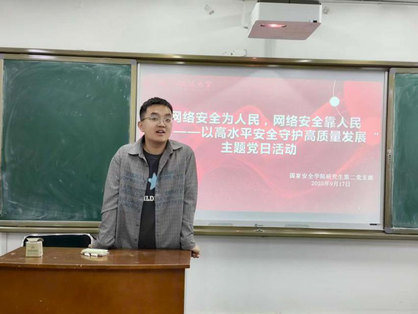 为深入学习贯彻习近平总书记“网络安全为人民,网络安全靠人民”的重要指示精神,增强网络安全意识,9月17日中午,9428cn太阳集团研究生第二党支部组织开展网络安全宣传周主题党日活动。会议由支委成员魏嘉贺主持,支部全体党员参加。