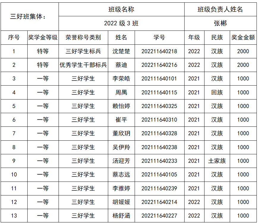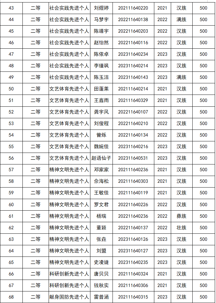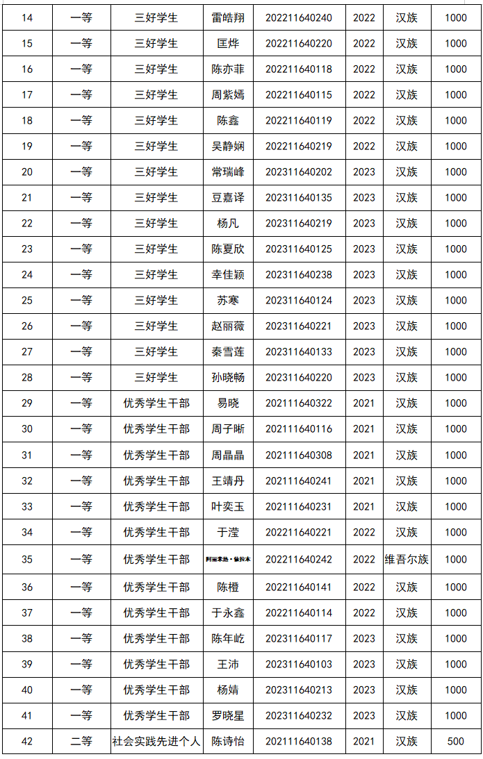 根据学校《关于开展2023-2024学年本科生奖学金及荣誉称号评选工作的通如》和《西北法大学本科生奖学金及荣誉称号评选办法》相关规定,经年级民主评议,学院党政联席会议研究通过,拟推荐以下同学为学生奖学金及荣誉称号候选人,公示期为2024年11月12日至14日,公示期内若有异议,请与各年级辅导员联系。