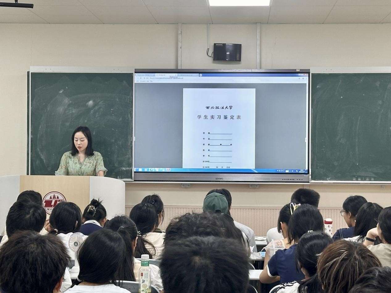 秦哲老师为同学们讲解实习内容和要求、实习考核与成绩的评定及实习表彰等具体制度,并指出,实习是学生在校期间的必修实践教学环节,是本科人才培养不可分割的重要组成部分,同时也是奠定个人未来升学或就业的坚实基础,希望各位同学端正态度、提高认识,认真主动参与实习。
