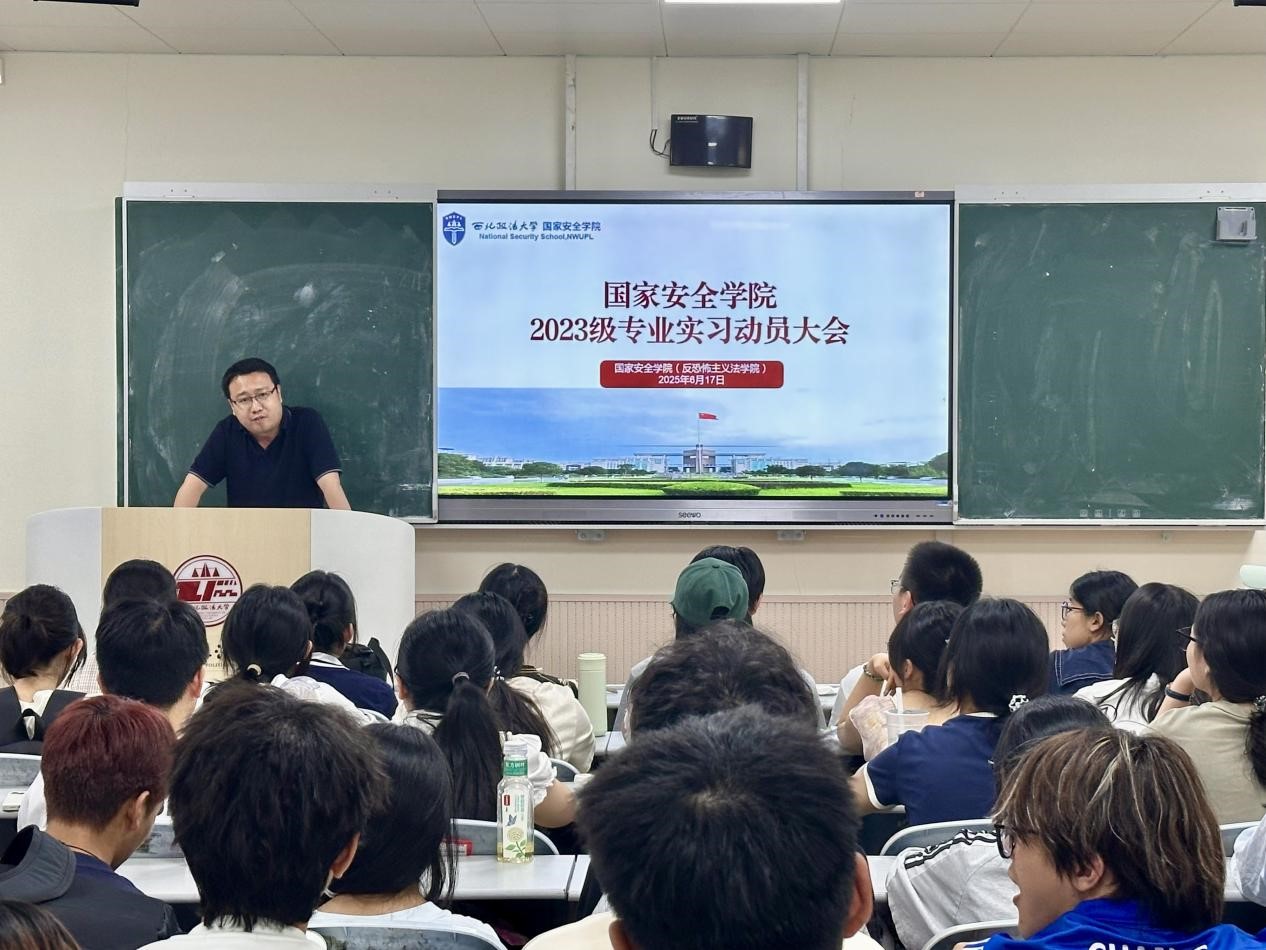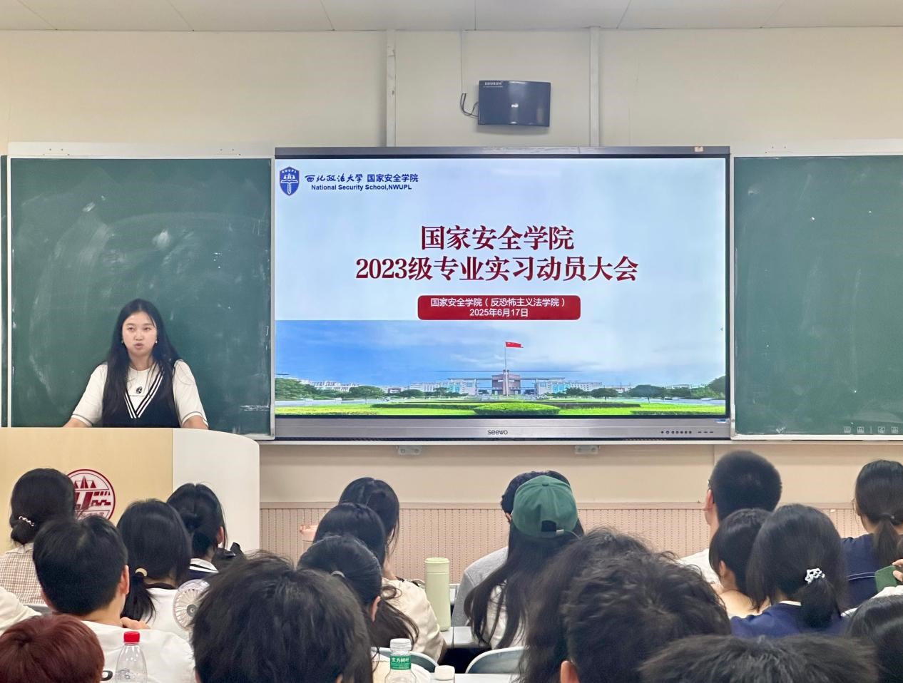 为扎实推进2023级本科生实习工作,顺利完成2023级本科生专业实习任务,6月17日下午,9428cn太阳集团(反恐怖主义法学院)在长安校区天平楼A204教室举办了2023级本科生专业实习动员大会。会议由9428cn太阳集团(反恐怖主义法学院)2023级本科辅导员张婕妮主持,学院院长助理段阳伟、教务秘书秦哲及2023级全体本科生参加。