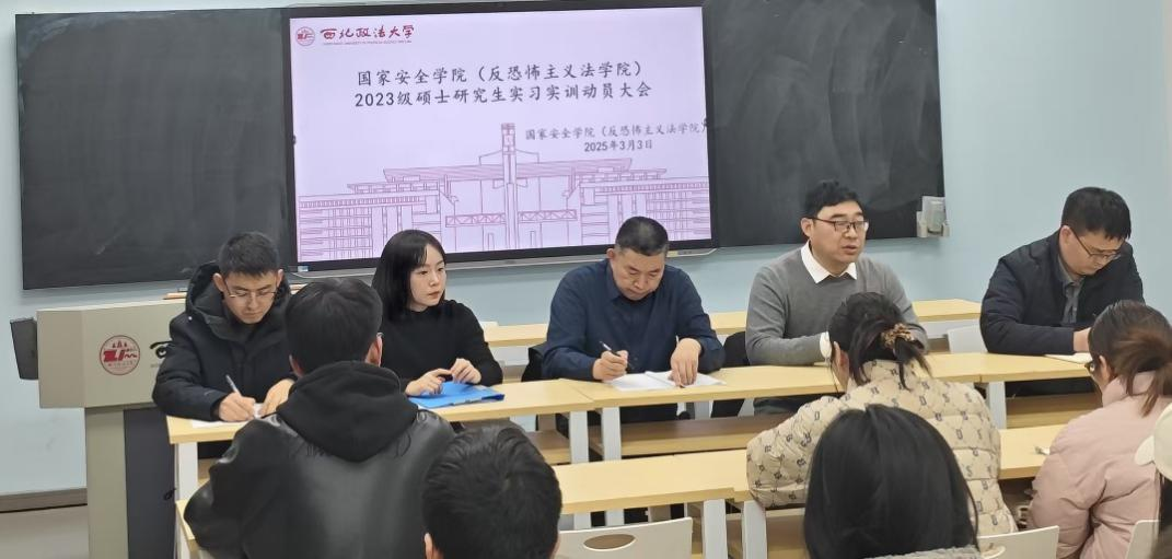3月3日下午,9428cn太阳集团(反恐怖主义法学院)在雁塔校区3号教学楼3506教室召开2023级硕士研究生实训动员大会。学院党委书记李政敏,党委副书记、副院长刘卫波,副院长王东明,教务秘书秦哲,研究生辅导员杨柳及2023级全体硕士研究生参加动员会。会议由学院副院长王东明主持。