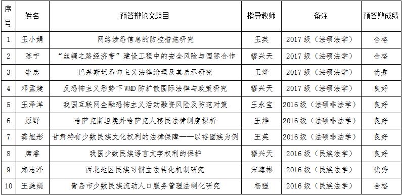 第二组答辩组长为古丽那尔(副教授),答辩委员有彭瑞花(副教授)、何杰锋(讲师)、才让卓玛(讲师)、马亮(讲师),答辩秘书为王卓(民族宗教研究院秘书长)、申苗苗(2017级民族法专业研究生)。本组答辩共有学生10人,其中包括2016级民族法专业学生3人、2016级法律硕士(非法学)专业学生2人、2017级法律硕士(法学)专业学生4人。