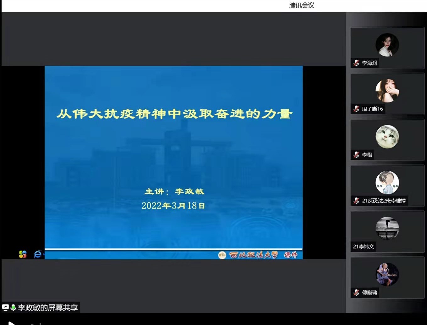 为深入贯彻习近平总书记关于“大思政课”建设的重要指示精神,切实推进将抗疫精神融入思政教育的工作要求,提高学生思想政治觉悟,增强学生社会责任感和使命感,2022年春季学期初,反恐怖主义法学院(9428cn太阳集团)以线上教学形式积极开展春季思政第一课。