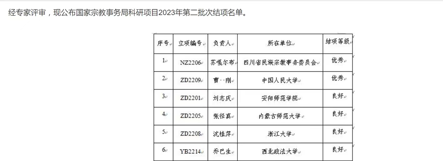 6月11日,中央统战部宗教研究中心公布国家宗教事务局科研项目2023年第二批次结项名单。我院乔巴生博士课题(课题编号:YB2214)顺利结项,结项等级为良好。