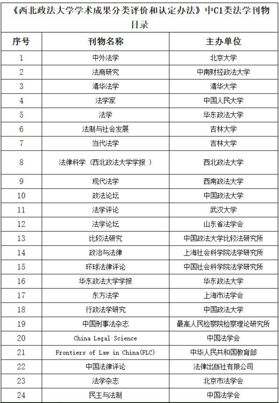 中国法学创新网于2024年6月17日更新了中国法学核心科研评价来源期刊(CLSCI)目录(2024年),共计27本。为促进我校法学学科发展,鼓励教师成果产出,经2024年9月5日学术委员会审议、2024年9月27日校长办公会讨论决定,将中国法学核心科研评价来源期刊(CLSCI)目录中的《China Legal Science》、《Frontiers of Law in China》、《法学杂志》、《中国法律评论》、《民主与法制》5种刊物调整到《太阳集团学术成果分类评价和认定办法》的C1类法学刊物目录。目前,我校C1类法学刊物目录共24种刊物(见附表)。科研处在成果认定工作中,《民主与法制》从2024年第18期开始起算,其他4种刊物从2024年第1期开始起算。